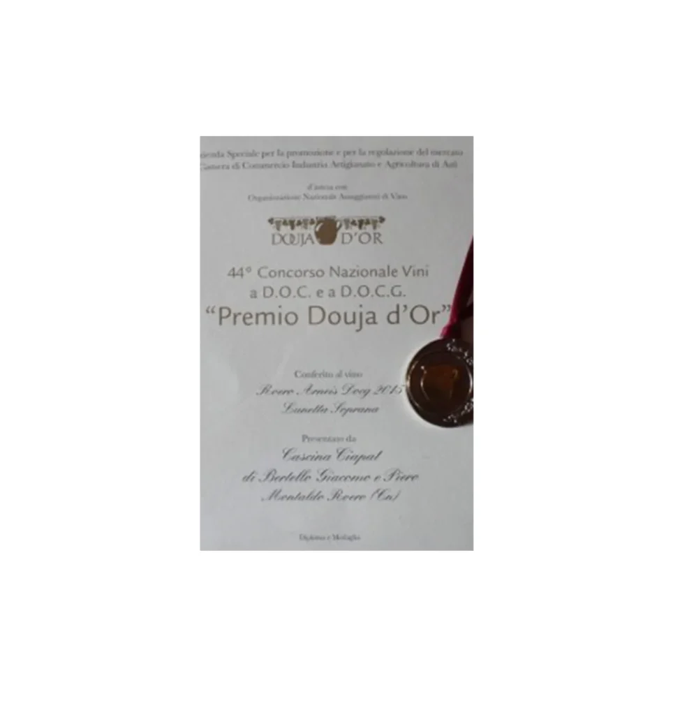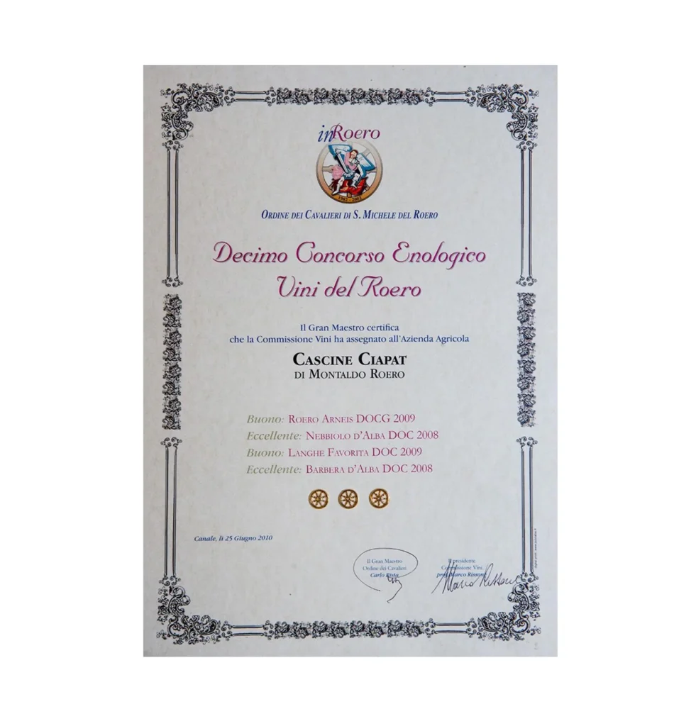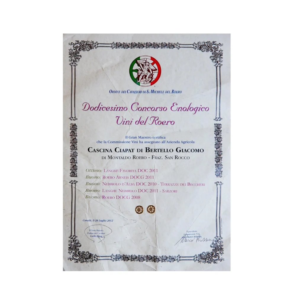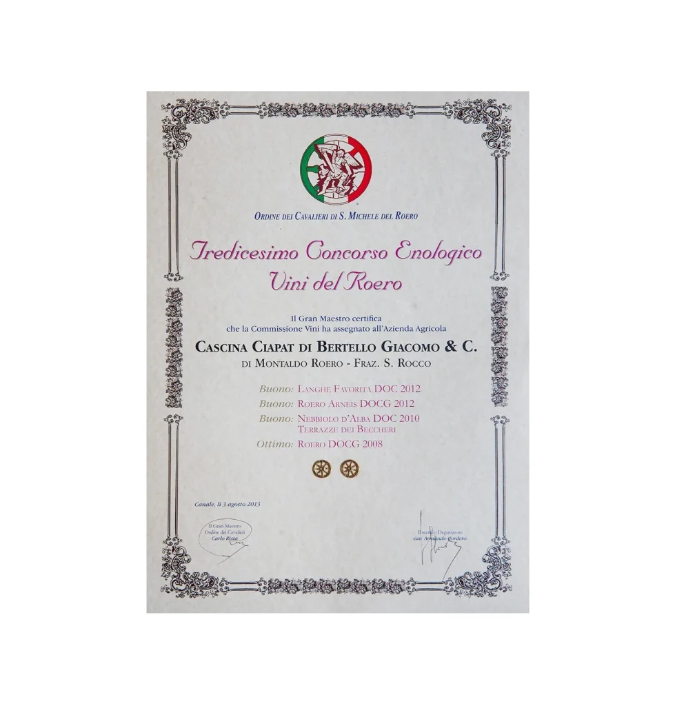 At the Order of the Knights of St. Michael of Roero, during the 13th Roero Wine Competition, the Grand Master certifies that the Wine Commission has awarded the Cascina Ciapat di Bertello Giacomo & C. Agricultural Company of Montaldo Roero, San Rocco District: