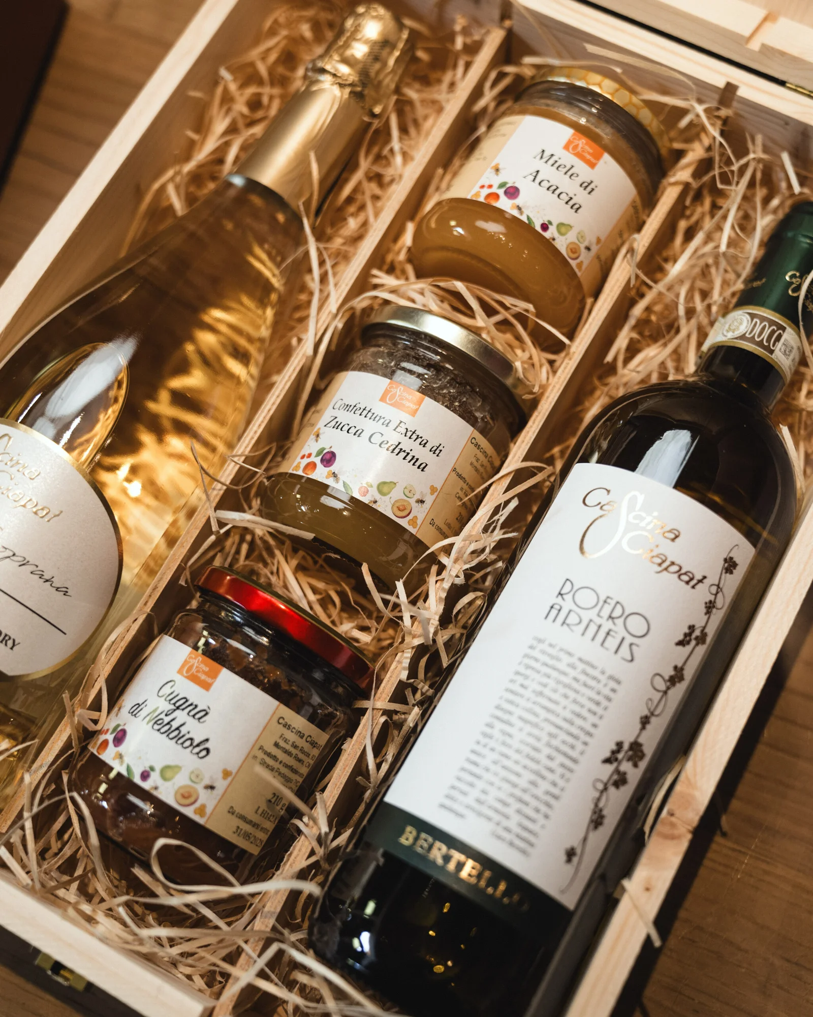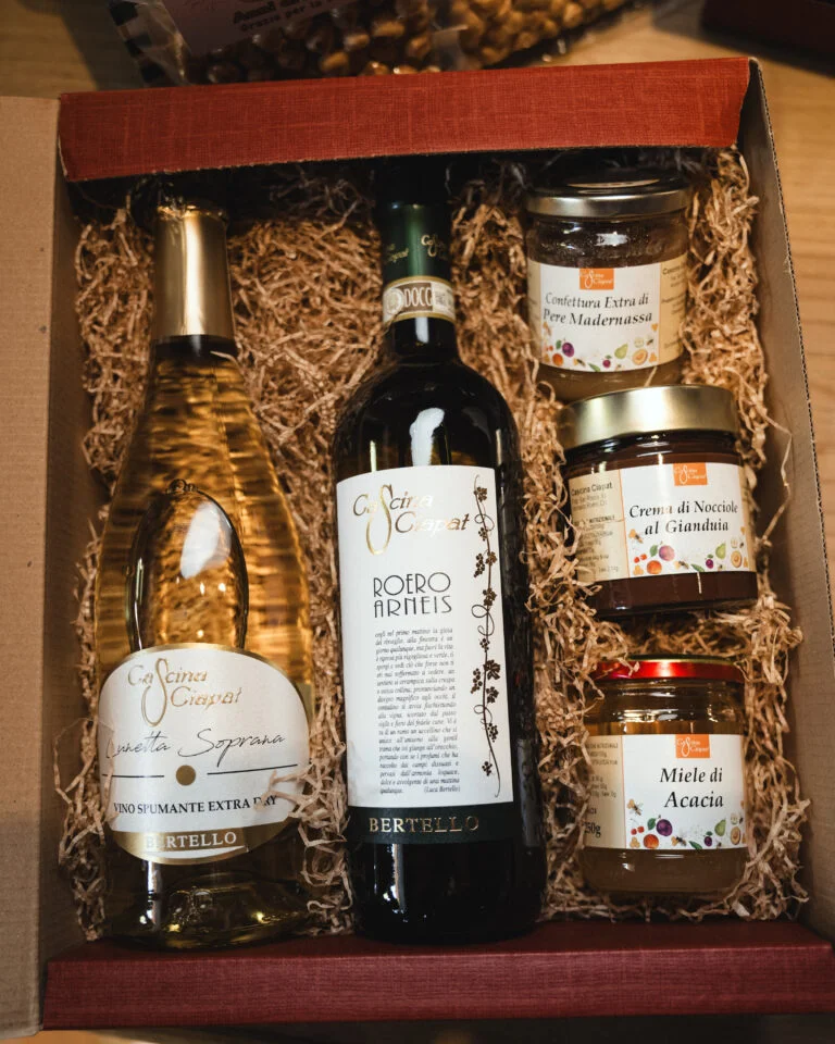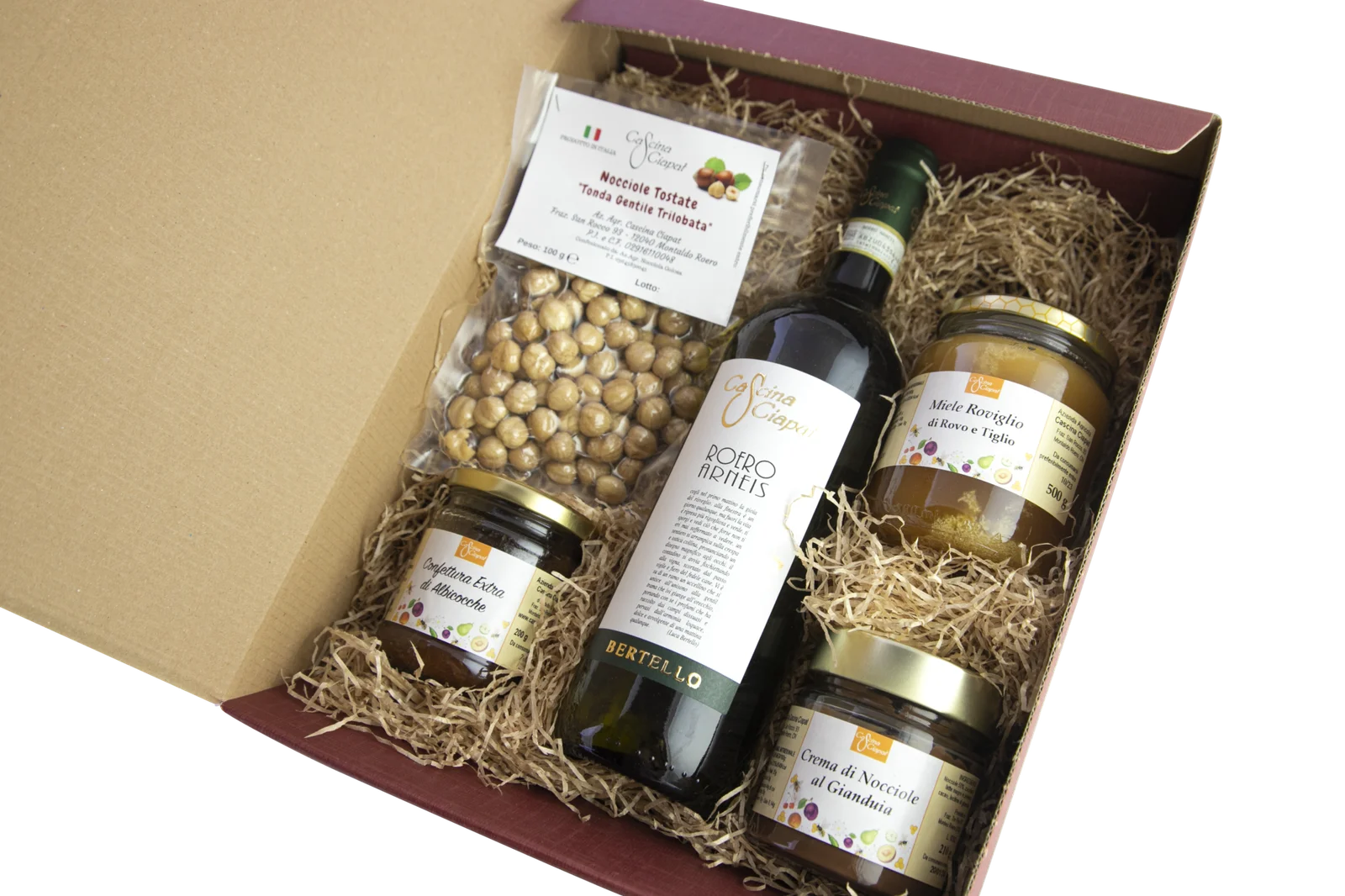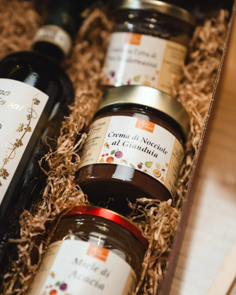 1) Bottiglia di vino a scelta+ 4 prodotti in vasetto a scelta + 1 pacchetto di Nocciole Tostate 200g
